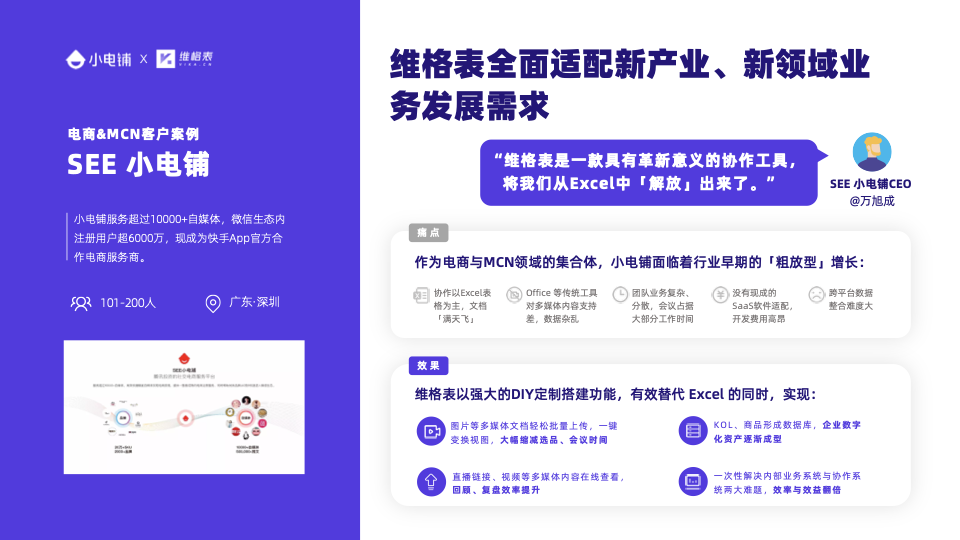 小电铺服务超过10000+自媒体,微信生态内注册用户超6000万,现成为快手App官方合作电商服务商。